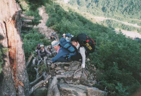 | 丸森尾根下部の岩場にて(平田会員・長谷川さん・鈴木さん) |