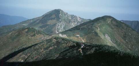 さて、天気は秋晴の澄みきった青空でとても清々しいそして、石転び沢の上を稜線迄目で追うと、新旧の梅花皮小屋がクッキリと見えた(温身平から)。そして、沢には雪は無く、ガレ場を石伝いにステップをとって登った一時間も登った頃、昨日高貝氏とダイグラ尾根を登り、梅花皮小屋に泊まって降りて来た、高橋氏に会った鼻の頭を赤くして(酒焼けか、日焼けか?)そして疲れている足取りに見えた昨日のダイグラが堪えたのか、昨夜の酒が利いたのか、後で聞いたところ、今朝は全く飲まなかったとのこと、何処か体が悪いのではないのかと気になったと思いながら“天気が良いのはそのせいだろうか”なんて冗談も考えたそれから、彼と別れ又、限りないガレ場を登りだした細かい石とか、砂の上は不安定なので、大きめの安定した石を探しながら登っていると、昔の岩登りの感覚が足の裏に伝わり懐かしく、また楽しい。