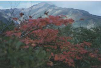 50分程で長之助清水に着いた。水は左に数分降りた所に有り、微かに水の音が聞こえる.握り飯を一つ食べた後出発する、そして5分で“お田”に着いた。何となく平らなので、この名が付いたのだろうか、それとも天狗が田植えでもしたか…ここには直径1.5〜2メータ−もありそうな杉の大木が、杉として一本だけ立っていた。その根本には“御田三社権現’,・と刻まれた石碑が置かれていた。どういう云われなのか?また、“大日杉”の名はこの杉の大木からなのか?…登山道はなだらかな尾根道で、ブナの木が目立ち、その中にムシカーリ(オオカメノキ)が赤い実を付けている。この間の台風の影響か足元にその赤い実が散らばつている。“滝切合”に着く頃 右の尾根にダケカンバが目立った。お田より一時間程で滝切合に着いた。標識があり。“右鍋越山経て伊佐領”と記されている.国体の後はあまり通っていない様なので道は荒れている様だ。ここからブナは見当らず、低木帯になり、ムシカリの紅葉がきわだってきた。天気は良く、遥か前方には“切合小屋”が見えるようになった。急な登りもなく楽に“地裁岳”に着いた。