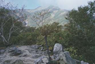 先着していた熊さんと再会の挨拶と同時に気付薬の話しとなった。まあ、少し位はということになり、少し!だけ飲んでそしてツマミも食べた。その後、熊さんと同行して来た佐藤氏も一緒に4人で歩き出した。天気は相変わらず良く、見通しがきくせいか、本山がグッーと目の前に立ちはだかっている。草履塚を登って行く途中で熊さんが立ち止まった。中腹辺りだったろうか、ここに小さいけれど夏場でも涸れずに湧いている水があると、教えてくれた。斜面の少し右側の草の有る所だが、文章では説明しにくい。大した距離もないピークを登り、下った所が“姥権現”であった.顔が姥で、お地蔵様の形をしたものが鎮座していて、体にはシャツの様なものを着せてある。誰かが言っていた。『シャツの下に手を入れて、胸に触れば女運に恵まれる』とか?もう一説には『昔、飯豊山は女人禁制であったが、或る時一人の女性が、内緒で登ってきたこところ、祟りにあい姥にさこれてしまった』とのこと。ここから10分も登ると“御秘所”といい右側がスパツと切れ落ちた岩場になっているが、短い距離であった.そして、間もなく“御前坂”の標識に着いた。この辺りにマツムシソウがあったと思う。