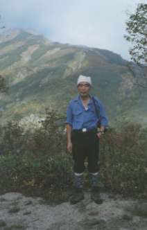 地蔵岳頂上は右に数メーター行き、二・三段登った所の平らな場所であった。そして、此処から待望の飯豊本山が程良く見える筈が、霧で八合目辺りまでしか見えなかった.ここにはナナカマドの木が有ったが、台風の影響で葉っぱは全部飛んでしまい、坊主になっていた。道を左に取り、いくらか緩やかな下りがずうっと向こうまで続き、そして、又登り切合小屋へと見通しが効く。高橋氏が“昔ははこの辺りにセンジュガンビが群生していたが、乱掘されてしまったと嘆いた。と、話している時、狂い咲きのセンジュガンビの白い花を見つけた。見回すとまだいくらか有る様だ。その他注意して捜して見ると、ツルリンドウ、ヒヨドリバナ、ウメバチソウ・ミヤマコウゾリナの名残があった。道は、そんなに急でない下りが続き、途中はムシカリの赤い実が日立つが、高度が下がるに従ってブナが現われ出した。40分近く下り、ー番低い場所になるかなと思う頃、“日洗い清水”に着いた。左下数メーターの辺りで水が光っていた。そして、5、6メーター進んだ右手に格好のテント場があった。それから今度は穏やかな登りになり、20分も進むと道の両側にヒメサユリの名残が有った.花の時期にはヒ