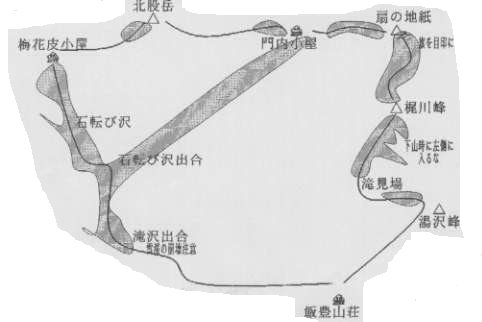 扇ノ地紙から梶川尾根は、ケルンまで雪渓が残り、ガスが出た場合に迷い、門内沢の方に入りやすいので注意して欲しい。梶川峰から下は夏道が全く顔を出しておらず、滝見場まで急斜面に雪渓が付いているので要注意個所である。下りコースでは左側のトットバノ沢に入りこんでコースを見失うことのないように注意することが必要と思われる。