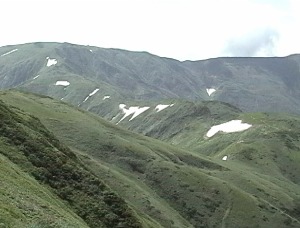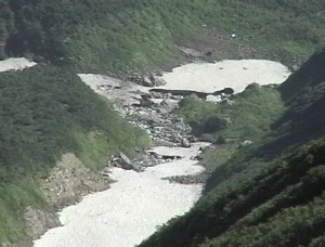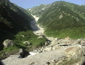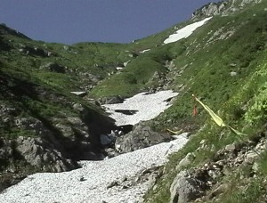 水場から黒滝に向かいますが、黒滝は既に雪渓が大きく崩壊しています。黒滝の手前は薄くなっていますので、早目に左岸の踏み跡に取付き、黒滝の上に出てください。黒滝と草付き(中ノ島)の間の雪渓は、嫌らしくなり始めています。左岸の踏み跡を忠実に辿ってください。左岸側からの枝沢に出たら,正面の尾根に踏み跡がありますから、それを真っ直ぐに登って、途中から左手(右岸側)の小沢を横切り、草付きの登山道に出ます。下山時は、草付きを下りきらないように注意してください。今回は、枝沢から斜めに草付きに取付こうとして,途中で鈍く嫌らしい雪渓の音がしたので、慌てて逃げました。雪渓に近づかない方が良いでしょう。