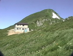 草付きの最上部で左手の小沢を横断する部分は、全く雪がなくなった。草付きの広場から若干の残雪を登り、夏道を登って、梅花皮小屋に着く。
