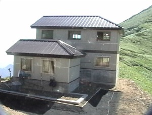 | 北股沢出合の清水から黒滝と草付き | 新装なった梅花皮小屋 手前が管理棟 |