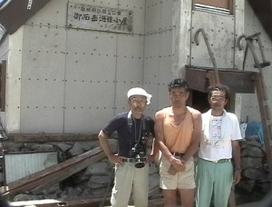 | 烏帽子岳山頂から御西小屋までの主稜線 | 御西小屋にて(松葉さん・筆者・小椋さん) |