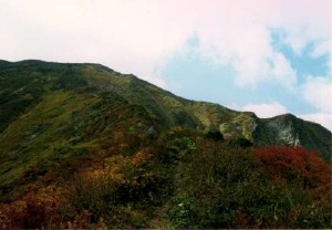 登る途中の景色は、まだ紅葉が始まったばかりという感じであった。 赤鼻の分岐を過ぎて途中の尾根を登っている間も頂上付近にはガスがかかって見える。下山者に聞けば頂上はガスで何も見えなかったとのこと。下から見ていると今にも晴れそうでなかなか晴れない。11:30頃、頂上目前にして、寒いし腹もへったので昼食をとりながら様子を見ることにした。