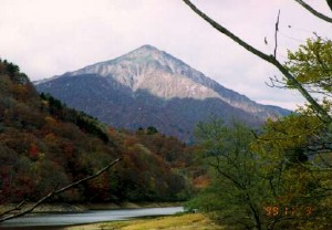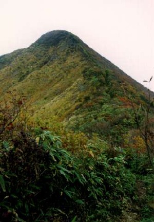 長井を6:45に立って祝瓶山荘に7:50に到着。長井〜山荘間は紅葉狩りにはまだ早い。山荘を8:00に出発する。 下の方は薄日がさしているが頂上付近はガスがかかって見える。 途中、直登コースが危険であることを表示した看板があったので赤鼻コースを登ることにした。