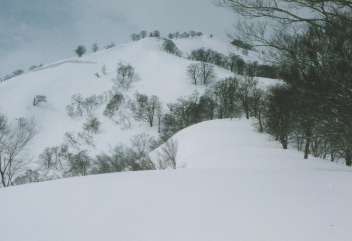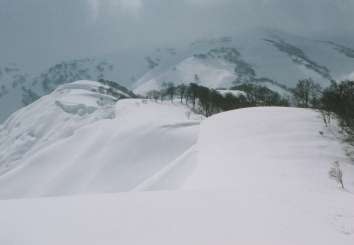 850mから950mまでの急斜面には雪崩落ちてきた雪塊が一面に広がっていた。950mからは雪がシールにくっつき、歩きにくいこと、この上もない。山頂まで登ってしまうと風があると思い、10:40〜11:21ブナの根元で何時ものようにラーメンを煮、ODDと交信する。腹ごしらえを終えて、11:30西俣ノ峰山頂に立つ。行ける所までと考え、枯松峰に向けて歩き始める。下り始めてすぐ、雪庇の亀裂が巨大雪庇の中程にあるので驚く。雪庇の末端から十分に余裕を持って進む。が、登りに差し掛かった途端に穴に落ちてしまった。亀裂の兆候は認められなかった。何とか這い上がり、ここから戻ることにした。