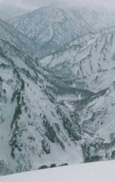 なんとかシモカバタケ沢からでて、のんびりと奥川入に向かう。今日始めての雪崩が轟音を響かせて対岸の川倉で落下して行くのを眺めながら、13:05奥川入着。