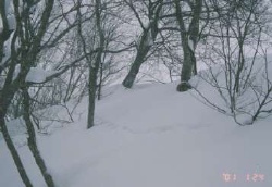 峠から北北西の尾根に取り付く。すぐに杉林を抜けてナラの薪炭林となるが、途中途中に驚くほど大きなナラが残っている。雪庇は北東に出ているが、雪庇というほどには発達しておらず、雪稜といった感じである。ところがこれが結構厄介で、風下側に出れば足元が崩れて登れないし、風上に出れば雪の上に出たナラの枝が邪魔をする。やむなく風上側の急な斜面をジグザグに登っていると、突然目の前5mの雪面から兎が飛び出した。兎も必死に斜面を登って逃げようとしているのだが、深雪に足を取られてモッコモッコとユーモラスに腰を持ち上げながら跳ねて、尾根を越えて行った。