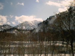 8時、スキーシールを付け出発。右側斜面からの雪崩に注意しながら林道を歩いていく。気温が上がるにつれ、昨日降った雪が湿雪になり、重りのようにスキーにくっつく。たまらずシールを外し、スキーだけで歩いていく。雪に埋もれた針生平のぜんまい小屋を通過した辺りで、東側に祝瓶山が見えてきた。雪にすっぽりと覆われたその姿は非常に格好いいのだが、それにしても高く、遠い。早くも林道歩きでバテ気味になる。2時間かかって、やっと大石橋に到着。踏み板が一列だけかけられている。スキーをザックにつけて慎重に渡る。更に大石沢をジャンプでクリア。そこからコースを東に離れ、尾根に取りに付く。これはOTJに教わったルートだが、確かに近道の上、樹間も勾配も手頃である。さすがここ一帯を荒らし回っているだけのことはあると感心する。
