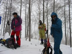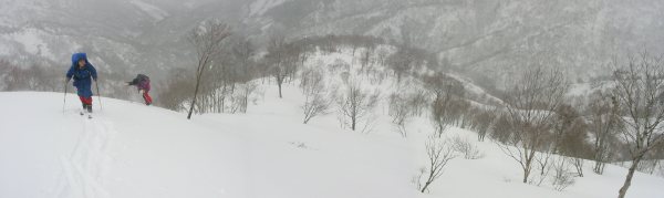 ここから風景は一変する。平坦な尾根が北西に続き、見事なクロベが点在している。シールに雪が付着し(ボッコが着いて)、重くかつ滑らない。風下にやや下り11:43〜12:06食事を取る。雪庇は全体としてそれ程発達していない。天候は、青空が見え風もなくなったと思うとすぐに風雪にめまぐるしく変わる。1,150mからの急登は、ボッコが着いて滑らないことを利用して直登する。新雪に覆われている部分は逆滑りするので、ウインドクラストした部分を選んで登る。1,210mでブナ林の平坦地を進み右手の急斜面に取り付く。視界のないときのスキー滑降はルート選択上かなり危ないと思えたが、幾つものデフ布が付けられていたので、新しく付けるのは最小限で済んだ。1,402m峰からまた平坦な尾根となり、最後の急斜面を登ると、見慣れない樹木が出てきた。AXL・立川君・HZUで植物談議になる。