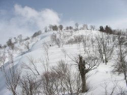 数箇所のスノーブリッジを観察したところ、倒木?の上に雪が被さっている個所を見つけ、右岸に移る。急斜面を登ると杉林になる。何処でも登れそうな広い杉林を順調に登る。21日のものだろうか、スキーのトレースが確認できる。10:26〜34杉林の中で休憩、何時の間にか雪となっていた。ルートを確認するため、900m付近から左手の尾根沿いを進む。右手は杉林が続いている。カラマツの植林地を過ぎた地点からデフ布をつけ始める。990m峰は雑木林であり、右手の杉林もここで終わる。PWDはシールの具合が悪く、遅れがちである。右前方の急斜面は雪庇が向かって来るように思えたが、難なく登りきり11:28、1,102m地点に達する。