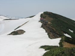 石転ビノ出合では、冬季に門内沢から巨大な雪崩があったらしく、雪渓の凹凸が例年と変わっていた。石転ビノ出合、左岸の小沢は上部からの雪崩の危険性が高く、右岸の小沢は取り付きが危なく、ともに使用できる状態にはない。梶川出合上流の左岸水場は使用できるが足場注意。脇の大岩が既に露出している。梶川は出合直前まで大きなデブリが押し寄せている。地竹原末端の雪渓が狭くなる部分から左岸の夏道に入る。例年のことだが、木が倒れたり道が崩れたりしており、今後の補修が必要。彦右衛門ノ平は雪の上、まだ多少雪崩の可能性もある。下ツブテ石に降りる沢の雪渓に穴が開き始め、ルート選択に神経を使う。その後、平坦地まで夏道となり、新緑のブナ林を上の砂防ダムまで歩く。温身平の交差路から除雪された砂利道を歩いて天狗平へ向かう。