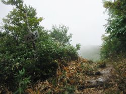 天候は午後から回復するとの予報なので、ゆっくりと起き朝食を食べてから自宅を出る。橋を渡ったT字路正面の標識に従って右折し駐車場に車を止める。カッパなし菅笠姿で08:44駐車場発。なお、今回は秋山ということで下着(半袖)は冬用とした。右足土踏まずが数週間前から痛みを感じるので軽登山靴とした。先ほどのT字路を進むと大きな二王子神社となる。トイレを使用、水洗であった。炊事場で登山者カードに記入し、08:53山道に入る。杉林の中にはキバナアキギリが咲いていた。登りになるとまもなく、09:07「一合目」の標識が杉の木に点けられている。杉林を抜け雑木林の中にはゴマナ・アキノキリンソウが咲いている。右手に斜上し、09:14大杉に着く。ここからは大きな岩が転がっている沢筋を登る。09:20-23神子石で撮影をしようとして、デジカメにCFカード入っていないことに気がつく。三体山の時と異なり今回は予備のカードを持参しているので事なきを得た。遠く近くで鉄砲の音がする。まさか熊が出て有害駆除を行っているのではという思いが頭をかすめる。しかし、音がやけに多い、そう言えば下の田んぼに網が張ってあった。あれは猿の防衛柵だろう。とすると、田んぼを守るための音に違いない。その後、登るにつれて音があちらこちらから聞こえてきたので、猿だけでなく鳥なども対象にしているのだろうと思った。そうこうしているうちに、09:25「二合目」の標識が付けられた水場を横切る。さらに若干登り、平坦になると道が二手に分かれる。右手は祠を経て正面の道に合流する。今回は正面の道を進んだ。