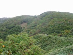 十字路の正面には「水場1分」の標識、左は山小屋。右折すると大きな杉に「三合目」の標識が付けられている。ここで今日始めて登山者とすれ違う。その後も1パーティが降りてきた。09:51細いブナに「四合目」の標識がある。この先、登山道の修復箇所が続く。昨年の工事であるが確かに効果はある。しかし化学繊維の土嚢が不満、登山者が足を置く所は破れ始めている。もっとも天然繊維の土嚢が入手しにくい現状を知っているので何とも言えない。10:01「五合目」の標識がある。独標(定高山)である。三角点の脇に高い鉄柱が立っている。10:12左の潅木に池がある。10:19尾根上に出ると、スチールポールが立っており、潅木となる。10:20左のブナ潅木に「六合目」に標識。10:22-28食事、久しぶりにコンビにではないオーダーメイドのお握りを頬張る。やはり味が違う、一気に大振りのお握りを食べてしまう。