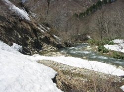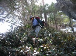 | 後ろには北股岳 | 潅木を掴んで下る |